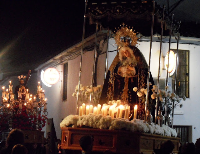 paso de la Virgen de los Dolores, Iglesia Parroquial San Blas (jC31-3-2013) Este dia la Virgen de Los Dolores luce un manto blanco en lugar del tradicional manto negro |