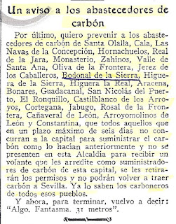 Por último, quiero prevenir a los abastecedores de carbón de Santa Olalla, Cala, Las Navas de la Concepción, Hornachuelos, Real de la Jara, Monasterio, Zahinos, Valle de Santa Ana, Oliva de la Frontera, Jerez de los Caballeros, Bodonal de la Sierra, Higuera de la Sierra, Higuera la Real, Aracena, Bonares, Guadalcanal, San Nicolás del Puerto, El Ronquillo, Castilblanco de los Arroyos, Cortegana, Jabugo, Rosal de la Frontera, Cañaveral de León, Arroyomolinos de León y Constantina, que todos aquellos que en un plazo máximo de seis días no concurran a la capital para suministrar el carbón como lo hacían anteriormente y no se presenten en esta Alcaldía para recibir un volante que les acredite como suministradores de carbón de esta capital, se les retiraran los permisos y no podrán volver a traer carbón a Sevilla. Ya lo saben los carboneros de todos esos pueblos.